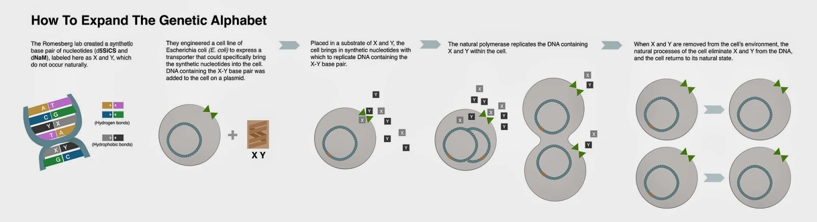 “letters,” or bases, not found in nature; the bacterium’s cells can replicate